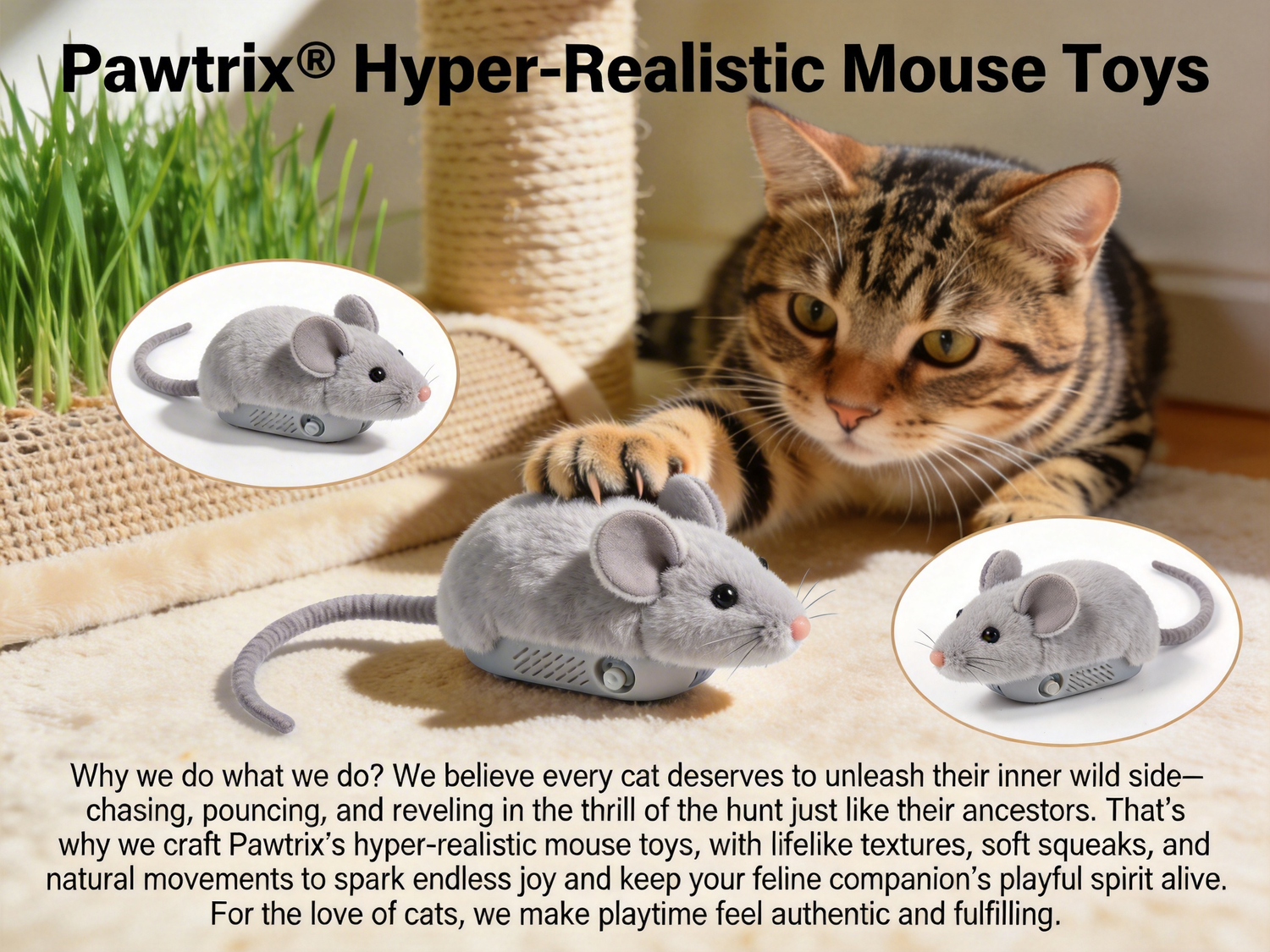 Why we do what we do? We believe every cat deserves to unleash their inner wild side—chasing, pouncing, and reveling in the thrill of the hunt just like their ancestors. That’s why we craft Pawtrix’s hyper-realistic mouse toys, with lifelike textures, soft squeaks, and natural movements to spark endless joy and keep your feline companion’s playful spirit alive. For the love of cats, we make playtime feel authentic and fulfilling.